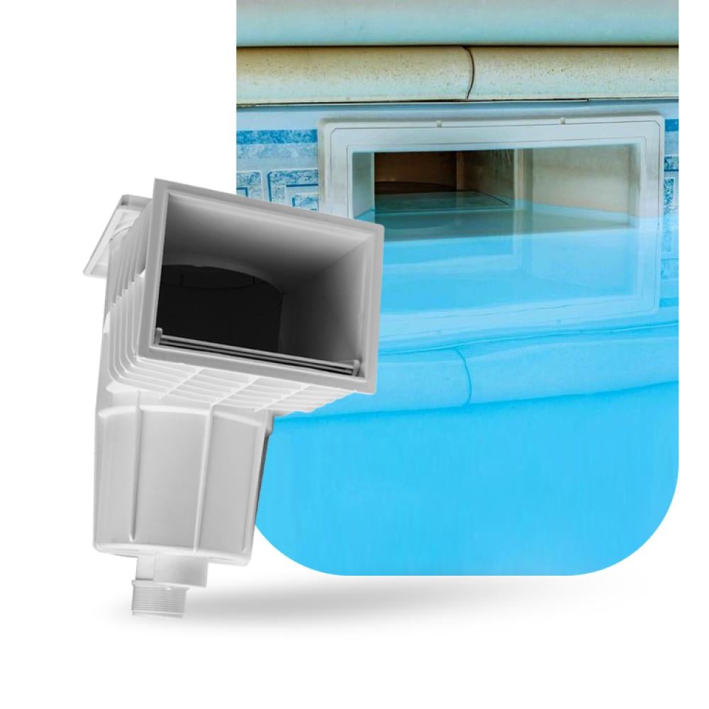 - يتم تركيب الاسكيمر على أحد جوانب جدران المسبح بحيث يكون جزء المربع الجانبي يلامس ماء المسبح وعلبة الفلتر تكون من الأعلى يوجد بداخله علبة تجمع الشوائب والاوساخ، تساعد على التنظيف بسهولة.