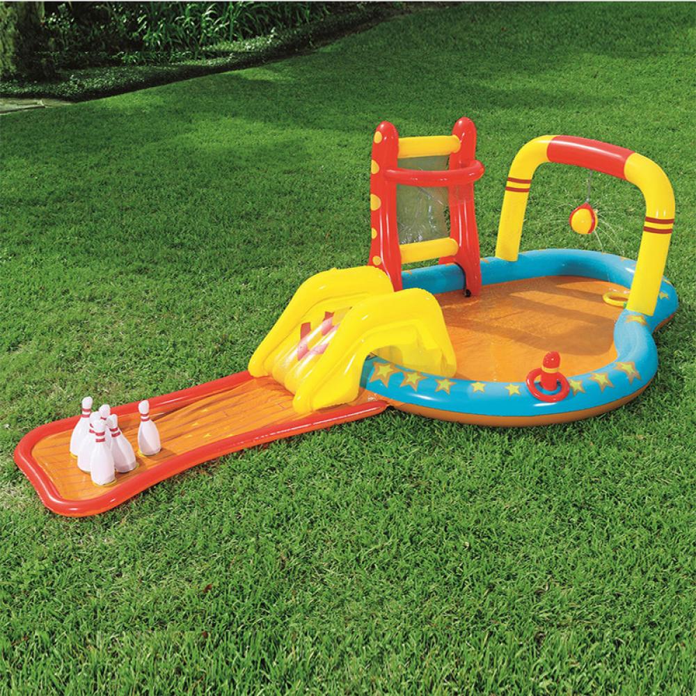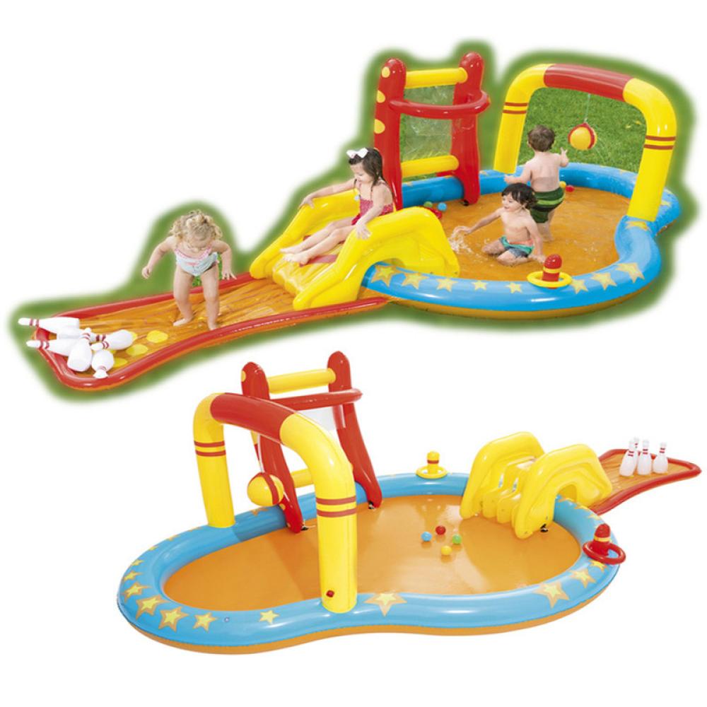 المحتويات: 1 حوض سباحة، 1 شريحة، 6 دبابيس بولينج، 1 حامل كرة سلة، 2 حلقتين قابلتين للنفخ، 4 كرات لعب، رقعة إصلاح
